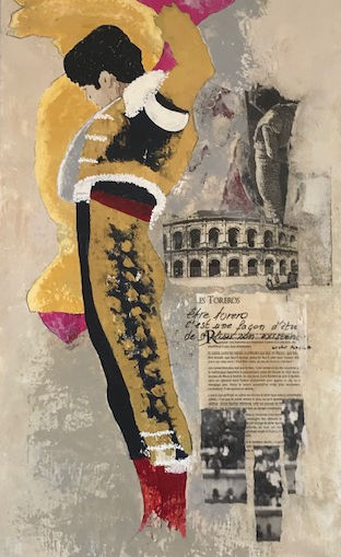 « Intriguée par la richesse de l’habit du torero qui à mon sens peut dénoter face à la dureté du combat de l’homme et de la bête , j’ai crée le vestiaire Je peins le costume sur un cintre pour le mettre définitivement en lumière.»